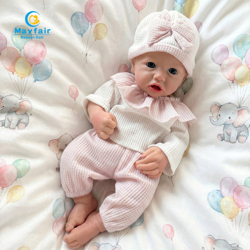 Mayfair baby doll is crafted from liquid silicone, ensuring safety and harmlessness to the body. It's a realistically detailed full silicone baby doll with a solid, weighted body for a lifelike touch.