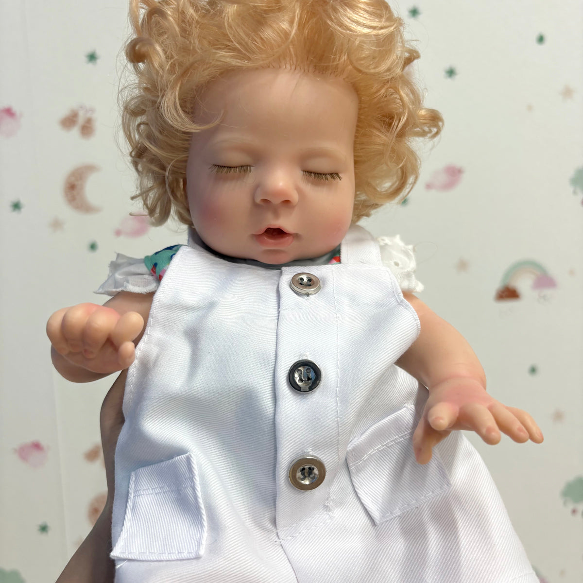 [Cleaning]: to clean the doll, use a soft, damp cloth. Avoid using harsh chemicals or soaps. Some people use mild baby soap. After cleaning, make sure to dry the doll thoroughly with a soft, dry cloth.