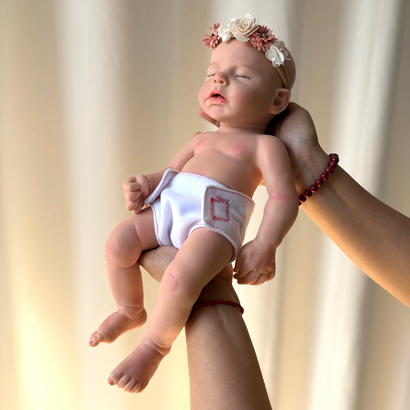 This baby doll's silicone skin mimics the velvety softness of a real baby. Its weighted body offers a genuine sensation, bringing a remarkable feeling when you embrace her.